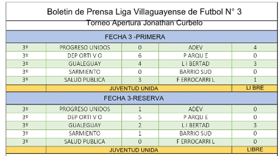 Este domingo se jugó la tercera fecha del torneo Apertura de la Liga de Fútbol de Villaguay, que dejó un saldo negativo para los dos equipos de San Salvador.